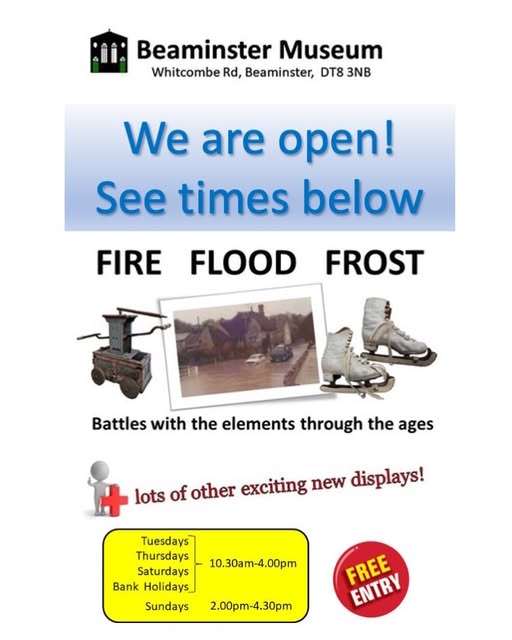 Now open for Summer 2026. Come and see our revamped Geology and Pre-History displays and our summer exhibition, FIRE FLOOD FROST featuring Beaminster’s 18th. century fire engine.